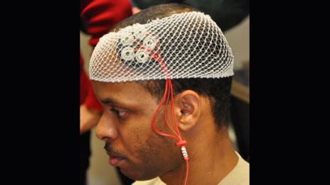 An airman at Wright-Patterson Air Force Base takes part in a brain stimulation trial (Michele Eaton/88 Air Base Wing Public Affairs)